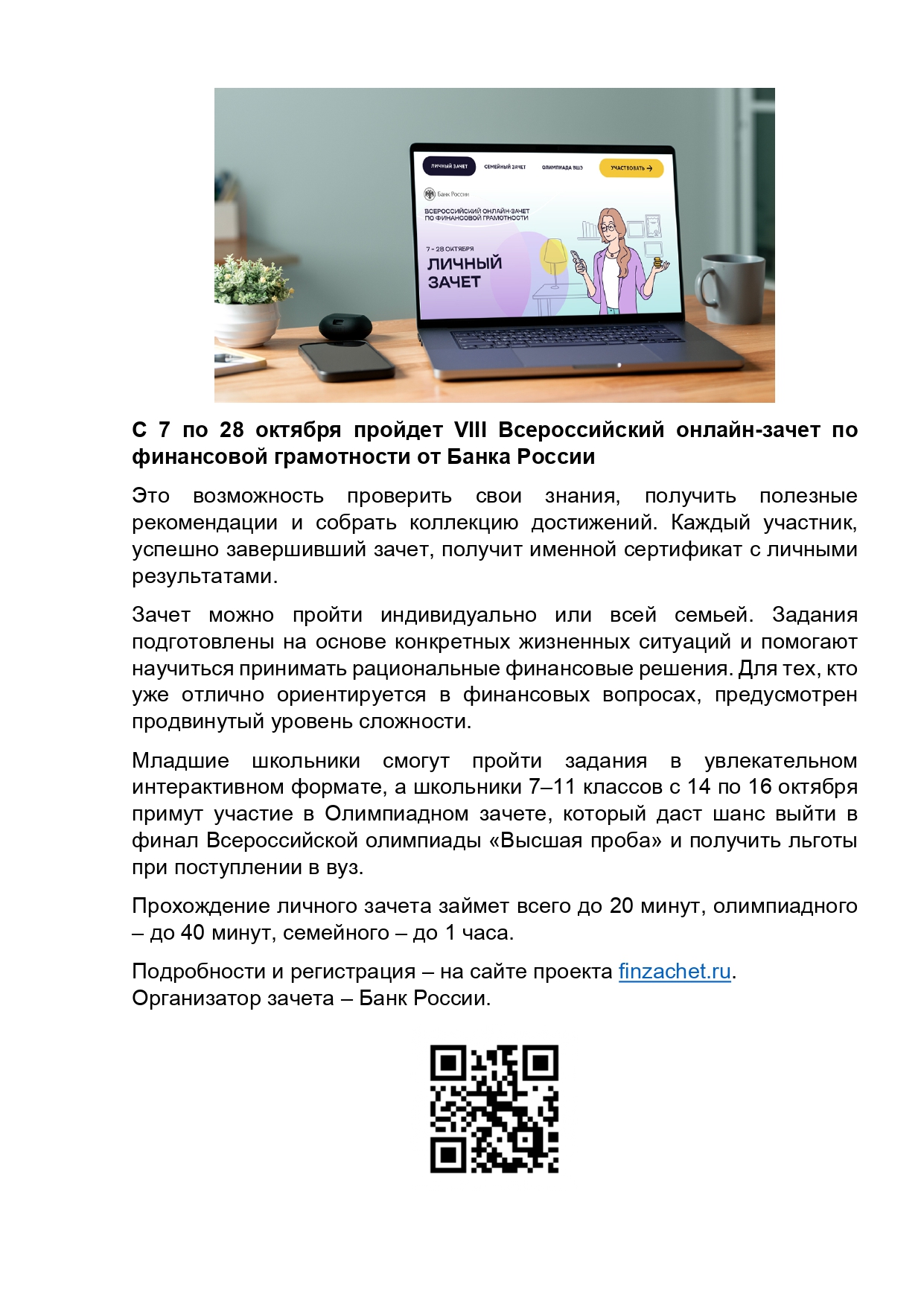 Обучающиеся и педагоги ОО смогут принять участие во Всероссийском онлайн-зачете по финансовой грамотности.