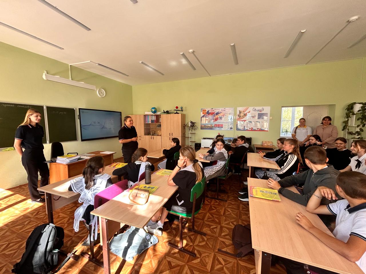Также рассказал обучающимся о том, как правильно вести себя на дорогах, пешеходных переходах и в общественном транспорте, рассказал о детских удерживающих устройствах для автотранспорта и необходимости их использования. Инспектор отметил, что использование наушников с музыкой и мобильного телефона недопустимо при переходе проезжей части дороги.