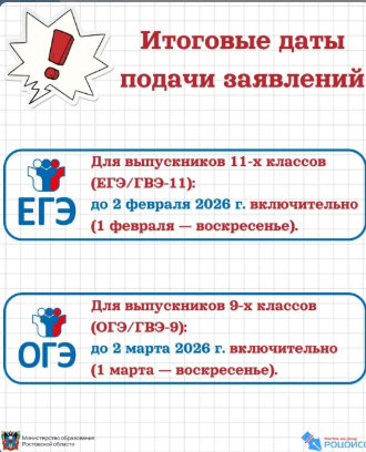 ❗❗ Рособрнадзор сообщил об изменении сроков подачи заявлений на ЕГЭ и ОГЭ в 2026 году Для выпускников 11-х классов итоговая дата подачи заявлений– 2 февраля 2026 г. включительно (1 февраля – воскресенье).